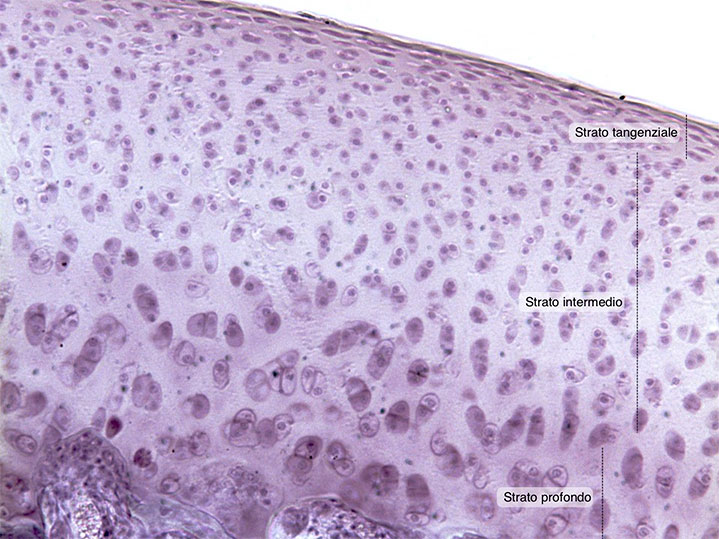 Istologicamente la cartilagine articolare può essere suddivisa in tre zone differenti, superficiale, di transizione e profonda o radiale, in base all’orientamento generale delle fibrille di collagene, alla morfologia e alla disposizione dei condrociti e alle proprietà di colorazione della matrice (Oláh et al. 2020). Nella zona superficiale le fibre di collagene hanno un orientamento parallelo rispetto alla superficie articolare, vi è una scarsa componente cellulare e di proteoglicani e il contenuto idrico è elevato. La zona di transizione è caratterizzata da fibre di collagene di diametro maggiore, disposte ad intreccio apparentemente amorfo, i condrociti presenti hanno forma sferoidale e vi è una maggiore secrezione di matrice extracellulare. Nella zona profonda le fibre di collagene sono disposte perpendicolarmente rispetto alla superficie articolare, è presente un contenuto idrico minore, la quantità di proteoglicani è massima e i condrociti si trovano impilati in colonne di 4-8 unità, perpendicolari alla superficie articolare. Tra la zona profonda e lo strato di cartilagine calcificata si trova una sottile banda più densa, visibile radiologicamente, di 5 µm di cartilagine mineralizzata, chiamata tidemark. Al di sotto del tidemark si trova una zona di transizione di cartilagine calcificata che riduce lo “stress riser” tra l’osso, molto più rigido, e la cartilagine. Nella zona di cartilagine calcificata, solitamente molto sottile, i condrociti sono rari, di grandi dimensioni e secernono matrice extracellulare simil-ossea. La sua funzione fisiologica è formare un’interfaccia cartilagine/osso per limitare la trasmissione delle forze dall’osso agli strati più profondi della cartilagine (Kon et al. 2012; Oláh et al. 2020). Ancora al di sotto troviamo l’osso subcondrale che fornisce supporto meccanico e metabolico alla cartilagine articolare, assorbe gli urti e mantiene la forma articolare (Oláh et al. 2020).