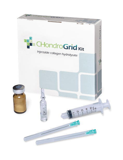 CHondroGrid® è un dispositivo medico composto da collagene idrolizzato a basso peso molecolare, appositamente formulato per l’iniezione intra-articolare e periarticolare. L’origine del collagene è la medesima del prodotto CHondroVITA, di cui è l’evoluzione.