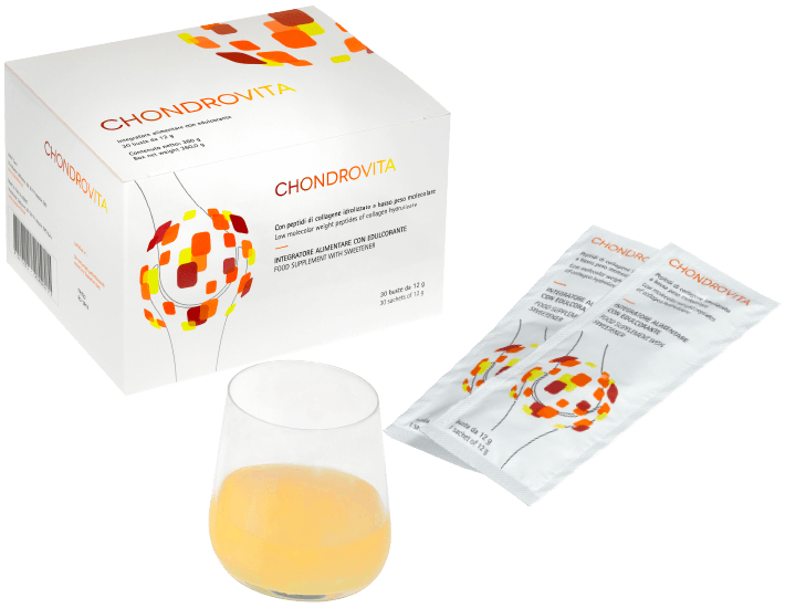 CHONDROVITA è un integratore alimentare che fornisce 10 g al giorno per 30 giorni di peptidi a basso peso molecolare da collagene idrolizzato. Questo dosaggio, unito al basso peso molecolare permettono di alleviare la sintomatologia dolorosa a carico delle articolazioni, migliorare la funzionalità articolare e aiutare il mantenimento del comparto articolare, rallentando la progressione della patologia artrosica.