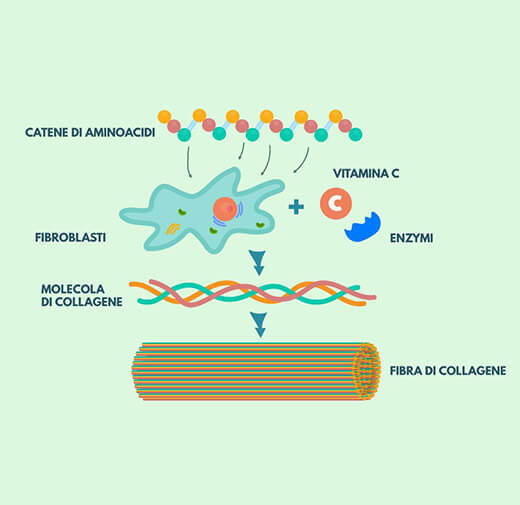 Il nostro organismo è in grado di sintetizzare direttamente solo glicina e prolina, mentre l’idrossiprolina viene sintetizzata indirettamente per idrolisi. Dati i numeri degli aminoacidi necessari alla costituzione di una singola molecola di collagene si può immaginare quale sia lo sforzo di sintesi di tutto il collagene presente nell’organismo umano, che costituisce il 6% del peso corporeo totale (Kon et al. 2012; Porfirio & Fanaro 2016).