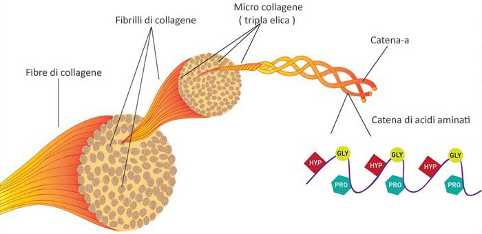 Il collagene è una proteina che si trova nel tessuto connettivo come pelle, ossa, cartilagine e tendini e costituisce circa il 30% delle proteine del corpo umano (Yamamoto et al. 2016; Porfirio & Fanaro 2016; Léon-Lòpez et al. 2019).