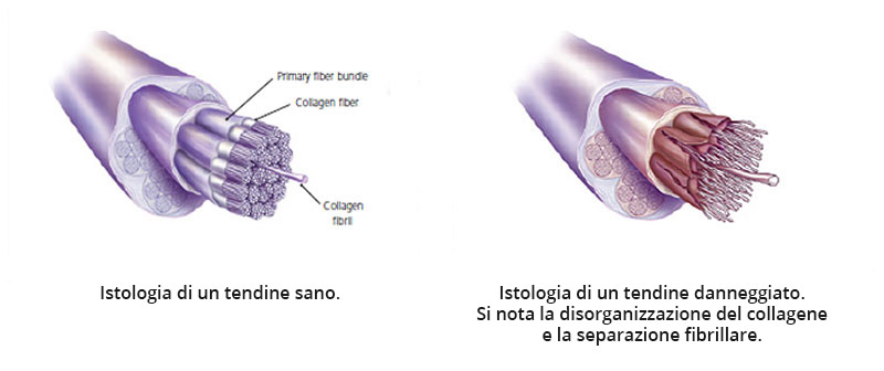 I disturbi legati alla degenerazione tendinea sono molto frequenti nella popolazione mondiale. Le tendinopatie sono spesso associate alla degenerazione e alla disorganizzazione delle strutture collageniche con aumento di mucoidi, proteoglicani e contenuto di acqua (Weinreb et al. 2014). Cambiamenti chimici e molecolari includono la produzione di metalloproteasi di matrice, apoptosi delle cellule tendinee, metaplasia condroide del tendine e l’espressione di fattori protettivi che sono stati osservati in tendini soggetti al sovraccarico (Weinreb et al. 2014). I cambiamenti macroscopici consistono nell’ispessimento del tendine, nella perdita delle proprietà meccaniche e nel dolore (Weinreb et al. 2014). Possono presentarsi rotture a livello fibrillare e possono progredire fino alla rottura completa del tendine per tutto il suo spessore (Weinreb et al. 2014).