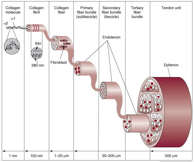 I tendini sono composti da triple eliche cross-linkate principalmente di collagene di tipo I, posizionate in maniera gerarchica parallelamente all’asse più lungo del tendine, in modo da avere una forte resistenza alla tensione. I tendini contengono anche un assortimento di proteine non collageniche presenti in bassa concentrazione ma con un importante ruolo funzionale (Weinreb et al. 2014; Thorpe & Screen 2016).