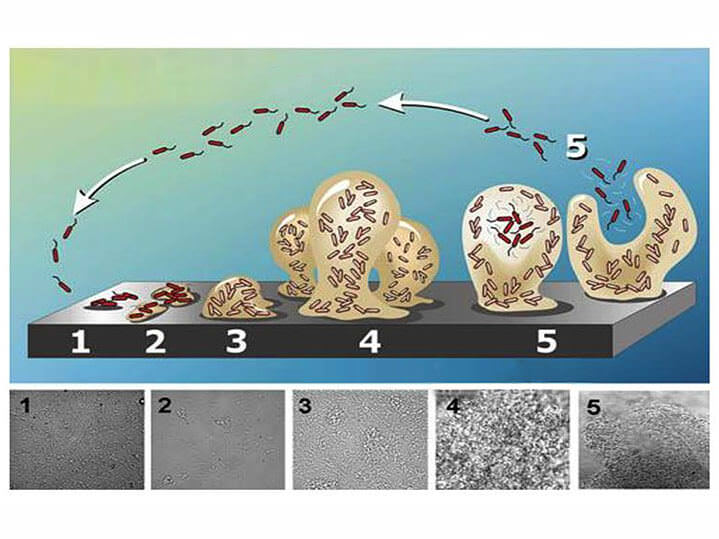 La formazione di un biofilm è un processo dinamico e complesso che si articola in diverse fasi: trasporto e adsorbimento, adesione alla superficie, formazione di microcolonie, produzione degli esopolimeri, maturazione del biofilm e rilascio dei batteri dal biofilm. Questo determina lo sviluppo di infezioni batteriche altamente resistenti.